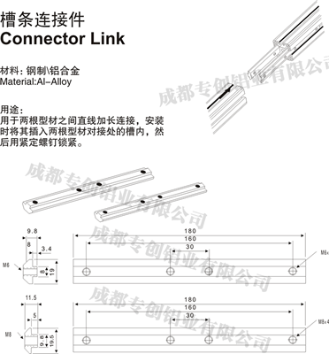 用于兩根型材之間直線加長連接,安裝時將其插入兩個型材對接處的槽內(nèi),然后用緊定螺釘鎖緊。